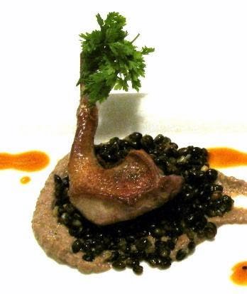 When ready, slice each breast into 3-4 pieces, one of which will contain the wing piece. Place about 1-2 tablespoons of morel puree on each plate and smear it across with the spoon. Mound a little less than ½ cup of the black barley, then lean the leg against it. Layer the sliced breast over the leg and place the sautéed, whole morels around the pile, 3 per plate. Drizzle with a little of the heated demi-glace .