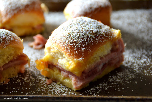 Slice the sliders into individual sandwiches and sprinkle with powdered sugar. Dip in jam.