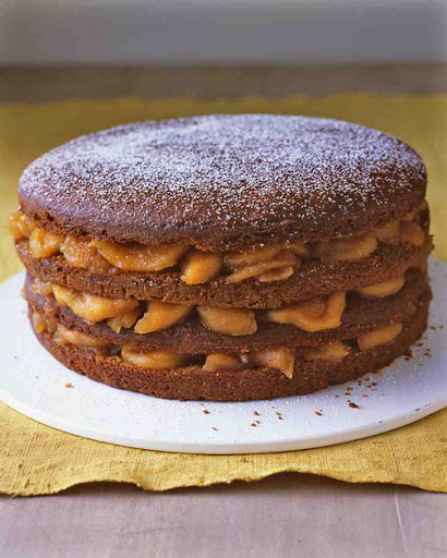 Using a long serrated knife, cut each cake in half horizontally. Place 1 bottom layer on a serving platter. Top with 1/3 of the apple mixture, spreading to edges. Stack 1 top layer on top of apples, and top with another 1/3 of the apple mixture. Repeat with remaining cake bottom and apples, and top with remaining cake top. Let stand at room temperature at least 1 hour before serving. Sift confectioners' sugar over top of cake.