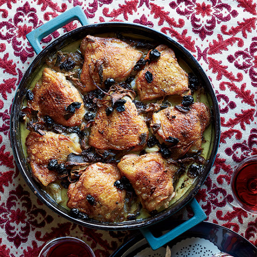 Braised Chicken Thighs with Potatoes, Porcini and Dried Cherries