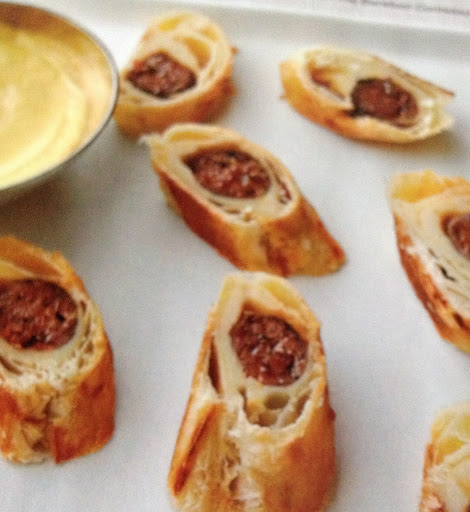 Unfold the puff pastry on a lightly floured board. Cut each piece in half lengthwise and brush the top sides with mustard. Divide the sausage into 4 equal pieces. Starting at the long end of the pastry, place 1 piece of the sausage on top of the mustard and roll it up tightly, overlapping the end by 1/2 inch and sealing the pastry by brushing the edge with water. Cut off the excess pastry. Roll the other 3 pieces of sausage in puff pastry. Place the 4 rolls, seam side down, on a baking sheet lined with parchment paper. Brush with the egg wash. Lightly score each roll diagonally to make 7 equal pieces. Bake for 20 to 25 minutes, until browned. Slice and serve immediately with mustard.