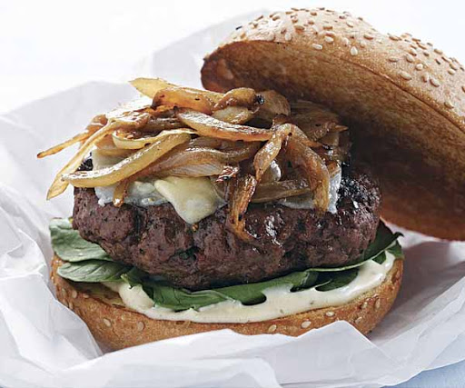 Toast the buns on the grill or under the broiler until golden, 30 to 60 seconds. Serve the burgers on the toasted buns with the caramelized onions, mayonnaise, and arugula.