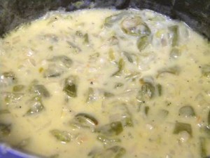In a large skillet, heat the butter on medium-low heat. Add the onions and cook for 5 minutes, stirring occasionally. Add the garlic and cook for 30 more seconds. Pour the half-and-half in the skillet and then add the chile strips. Turn the heat down to low and, a little at a time, add the grated cheese, stirring until it’s melted. Add salt to taste. Serve immediately with warm corn or flour tortillas.