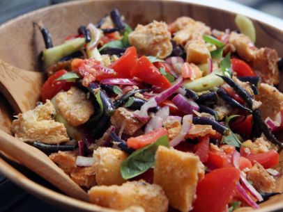 In a large bowl, combine the olive oil, red wine vinegar, Dijon mustard and some salt and pepper. Whisk it together and add the bread. Toss everything to coat, then add the tomatoes, cucumbers, string beans and onions. Toss everything again. Let the salad marinate 30 minutes before serving.