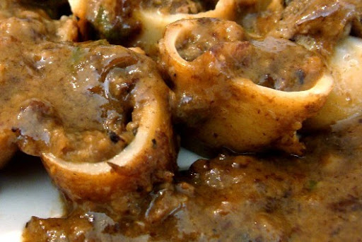 They are browned quickly on both sides before adding salt, pepper, wine, and the reserved stuffing mix. The sacs are turned again to coat both sides with the mixture, and then the heat is turned down to a very slow simmer. The pan is covered and the squid is allowed to cook slowly for at least 45 minutes, occasionally turning the sacs over. When the squid is done, it is transferered to a cutting board.