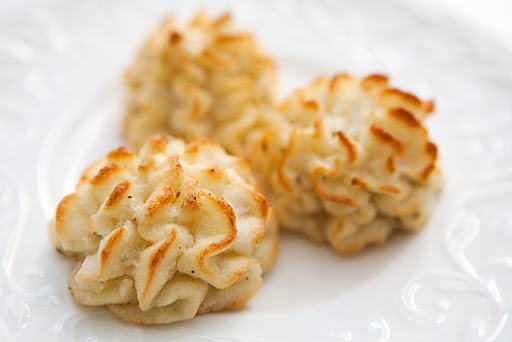 4 Using a piping bag with a large star point, pipe the potatoes onto a cookie sheet. Alternatively, you can just fill a casserole dish with the mashed potatoes, and use a fork to create lots of peaks on the surface. The swirled edges from the star-point piping bag forms or the peaks of mashed potatoes in a casserole dish will brown nicely in the oven. The browned parts taste great, so you want to maximize them. Whether you make piped portions or a casserole, paint the potatoes with the melted butter. Bake in the 425°F oven until nicely browned, about 20 minutes.
