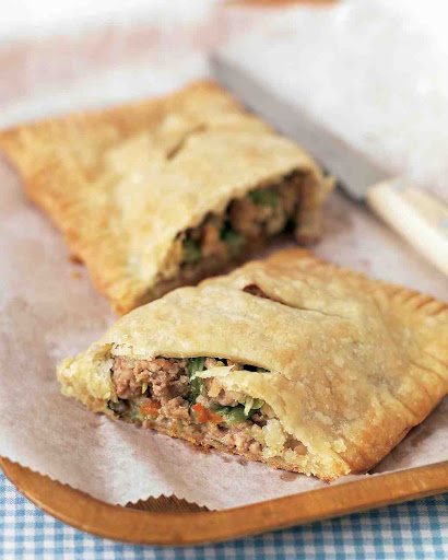 Preheat oven to 400 degrees. On a lightly floured work surface, roll chilled dough into a 16-inch square; cut into 4 equal squares. Dividing evenly, place filling on one half of each square, leaving a 1/4-inch border around the filling. Brush border with water; fold dough over filling to enclose completely. Press edges to seal, then crimp with a fork. With the tip of a paring knife, cut 2 to 3 small vents on top. Transfer pies to two rimmed baking sheets; bake until golden brown, 25 to 30 minutes, rotating sheets halfway through.