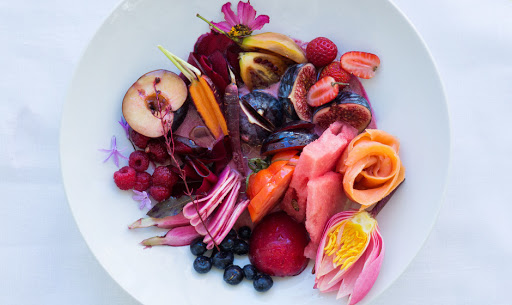 • Mixed red and purple raw fruits and vegetables (such as tomatoes, plums, berries, radishes, beets, rainbow carrots, and watermelon), halved, sliced, and/or cut into wedges