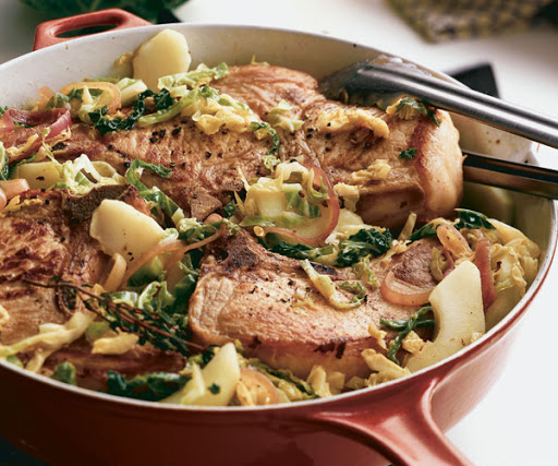 Return the chops to the skillet, burying them in the cabbage mixture. Cover the pan and simmer until the pork is just cooked through, about 15 minutes. Season to taste. Arrange the chops on plates and top with the cabbage.