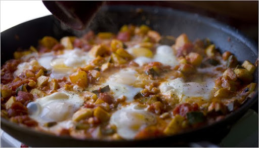 2. Using the back of your spoon, make six wells in the vegetable mixture and break an egg into each well. Sprinkle with salt and pepper. Cover the pan, and cook until the eggs have set, about six to eight minutes (the whites should be set, but the yolks should still be runny). Serve, using a spatula to dish out portions of pisto topped with an egg.