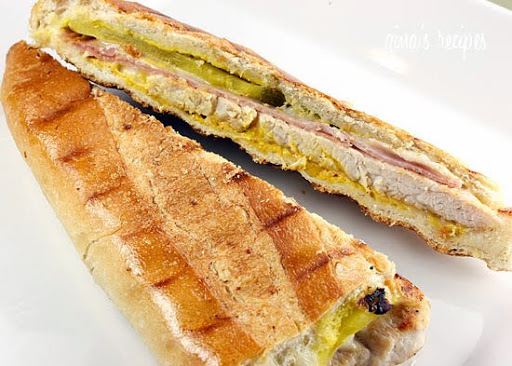 Spread mustard on both sides of bread. Place cheese and pickles on the bread. Add turkey and top with ham. Close your sandwich, and brush the bread with a little olive oil, put on grill pan and press down. Heat until the cheese is melted and the crust is a little brown.