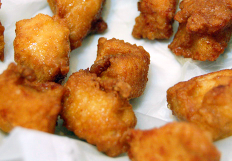 Heat the 3 cups of peanut or vegetable oil in your wok until it registers 350°F on an instant-read oil thermometer. Working in 2 or 3 batches, add the first batch of chicken cubes and fry until golden brown on the outside and cooked through, about 4 to 5 minutes. Remove the chicken with a slotted spoon and drain on paper towels. Repeat with the rest of the chicken.