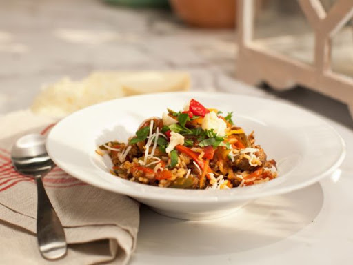 Stir the cooked sausage into the peppers and onions along with the rice, basil and parsley. Cook briefly until heated through.