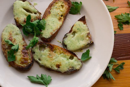 2. Turn on the broiler or preheat your oven to the highest temperature. While the oven is preheating, put the garlic in a food processor and pulse about 5 times until well minced. Add the cheese, parsley, thyme, wine, and pepper and process until most of the cheese has been pulverized to the size of chopped garlic. If you don’t have a food processor, let the finely chopped cheese rest overnight with the garlic, wine, and herbs.