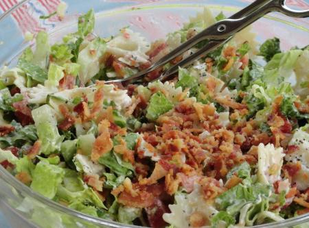 Mix the dressing with the pasta until evenly combined. Season with salt and pepper. Toss with the lettuce and cut up tomatoes coating completely.