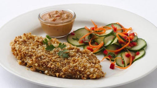 In shallow dish, mix together 1/4 cup peanut sauce and mayonnaise. In another shallow dish, mix together panko and peanuts. Dip chicken in peanut sauce mixture, then dip in panko mixture. Place on baking sheet.