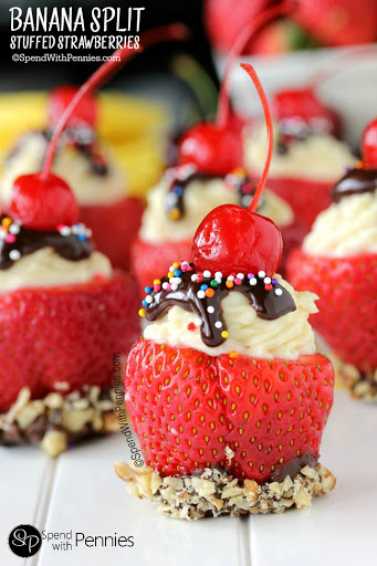 Cut a corner off of the Ziploc bag and pipe filling into each strawberry. Top with desired toppings (chocolate, sprinkles, cherries).