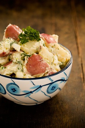 Boil potatoes with skins for 10 to 15 minutes, until tender. Let cool just to the touch and cut into cubes. In a large bowl, combine remaining ingredients. Add potatoes. Mix gently and serve at room temperature.