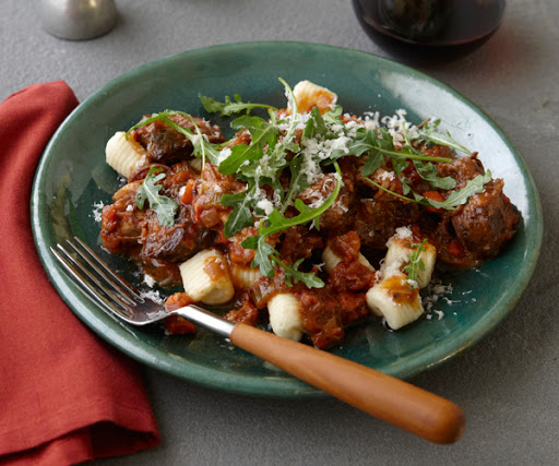 Using tongs, transfer the meat to a deep serving dish. Spoon some of the braising liquid over the gnocchi and toss to coat. Spoon the gnocchi over the meat, and pour the remaining braising liquid over the top.