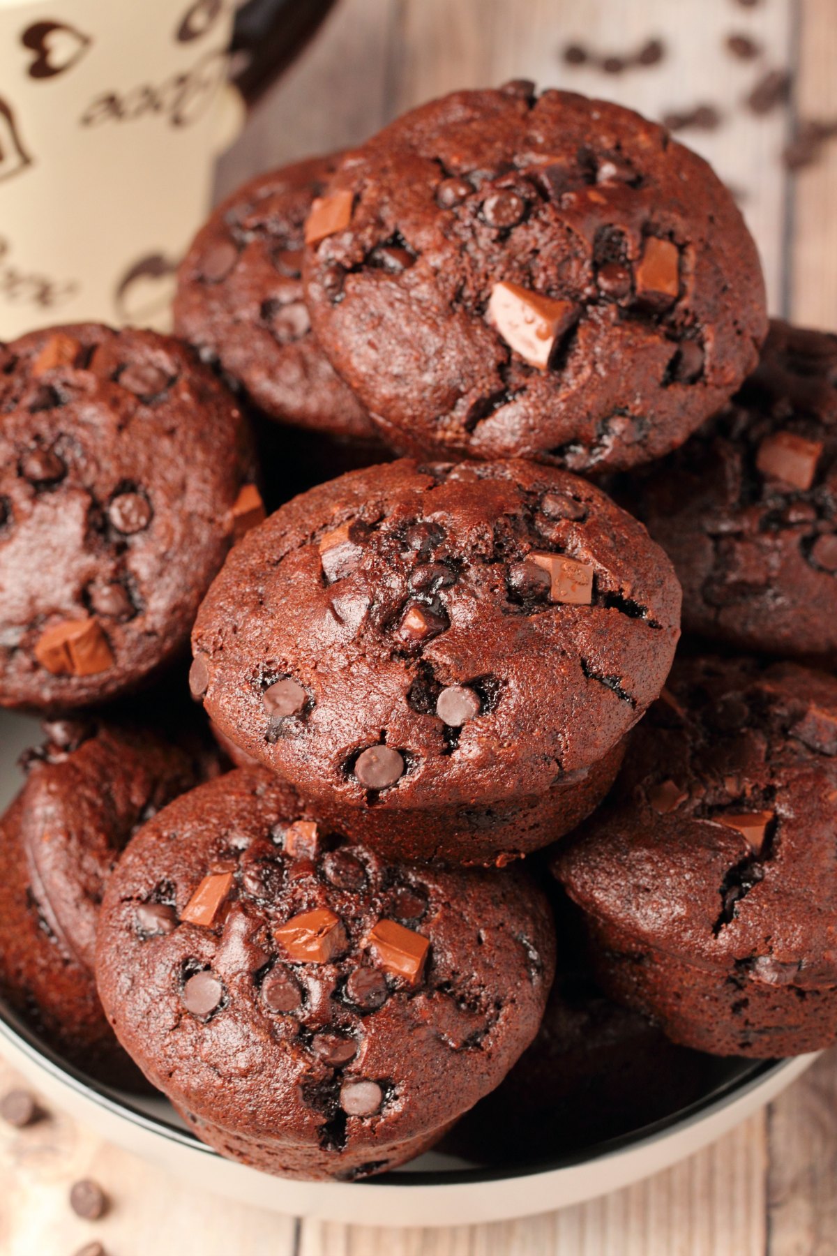 Double chocolate vegan chocolate muffins. These bakery-style muffins have a gorgeous domed top and are ultra moist and decadent.