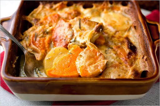 - This savory casserole is an almost classic gratin dauphinois (potatoes au gratin), with squash standing in for half of the potatoes and low-fat milk substituting for cream. It is a very comforting dish that can be baked ahead and reheated.