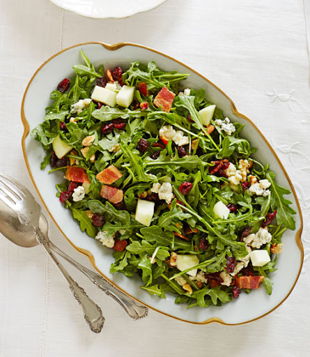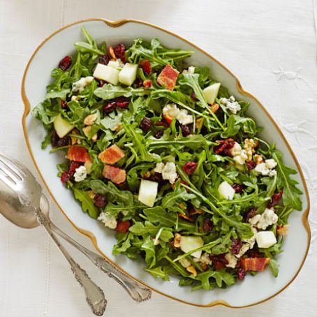 2 In large serving bowl, toss arugula with apples, walnuts, cranberries, and blue cheese.