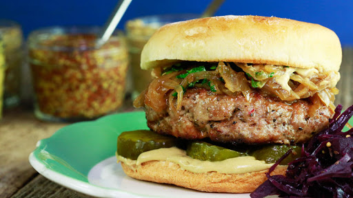 Serve burgers on lightly toasted rolls topped with lots of onions. Serve with pickles and mustards of choice, and salt and vinegar chips and red cabbage alongside.