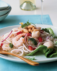 In a large bowl, toss the seafood with the vermicelli, tomatoes, bean sprouts, mint, red onion, peanuts and chile dressing. Arrange the lettuce leaves on a platter and fill with the seafood salad. Garnish with cilantro leaves and serve.