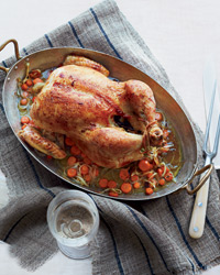 At 15 minutes Brush the chicken with the remaining 1/2 tablespoon of butter. Scatter the sliced onion and carrot all around. Reduce the oven temperature to 350°.