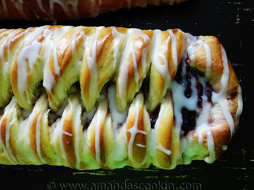 Repeat the rolling, filling, and braiding steps for the second piece of dough, using the remaining cream cheese filling and preserves. Gently slide the loaves on the parchment onto an insulated baking sheet. You should be able to fit both loaves on one sheet, but may need trim the parchment. Cover the loaves with a soft cloth and let them rise for 45 to 50 minutes, or until quite puffy.