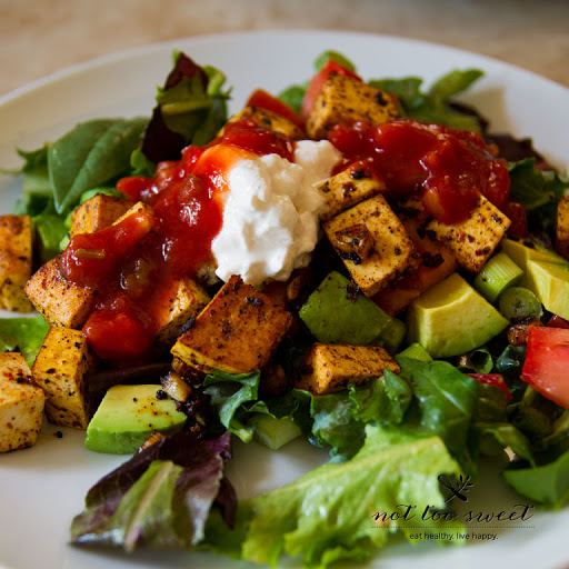 Mix together the lettuce, tomato, avocado, green onion, and olives. Add the meat and cheese and toss it together. Top with salsa and sour cream.