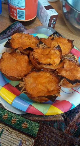 Preheat oven at 375 degrees. 2) spray 8 muffin cup in muffin,pan. 3) in a microwave bowl combine the chopped cheese chicken and wing sauce. melt on 2 minutes,and,stir,until everything mixes together and,coated. 4) take 8 wontons and press down wonton wrappers into,cupcake pan 5) fill each muffin with half the mixture and top with some cheese and then take the other 8 wontons,and put on top and repeat layer. then add cheese and pop in,oven for about 18 minutes. Make sure u spray your pan really good and wait u,til they r cooled completely to remove from pan-
