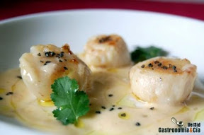 Limpia las vieiras y reserva el coral para otra elaboración. Pon un poco de aceite de oliva en una sartén y marca las vieiras por los dos lados, que se doren pero sin hacerlas demasiado para que resulten jugosas.