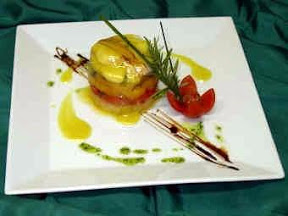 Pre-montaje.- Pelar los pimientos y cortarlos en tiras. Confitar las patatas con un diente de ajo y 2 dl. de aceite de oliva.