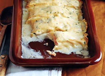 Put oven rack in middle position and preheat oven to 425F. Butter a 13- by 9-inch or other 3-quart glass or ceramic baking dish and spread half of sauce in dish.