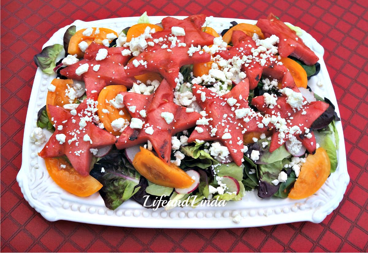 Arrange the mixed greens on a platter. Top with grilled watermelon shapes, 2 tomatoes, cut into wedges, blueberries and feta cheese.