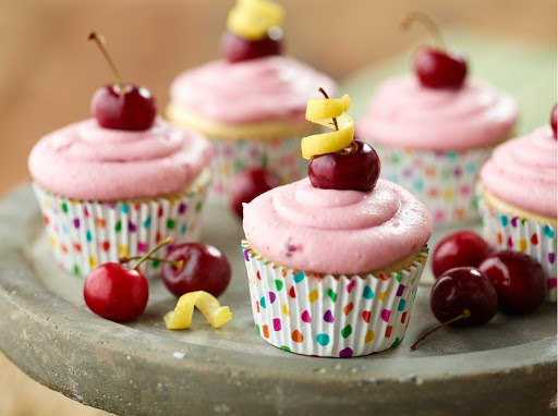 To prepare the frosting, fit a stand mixer with the paddle attachment. Beat the cream cheese and butter until creamy. Add the confectioners' sugar and vanilla and mix until evenly combined and the mixture has no lumps. Add the preserves and mix until just incorporated. Fold in the cherries until evenly distributed. Pipe or spread a thin layer of frosting on top of each cupcake, dividing evenly among the cupcakes. If desired, garnish each cupcake with a fresh cherry and a lemon twist.