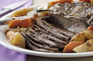 BAKE 2 hours or until meat is done (160ºF). Slice meat. Serve with vegetables and pan gravy.