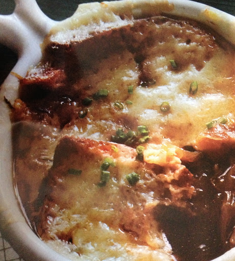 Preheat the oven to 425 degrees F. Divide the soup among 6 oven proof bowls. Spoon 1/3 c shredded meat into the center of each, then top each with 2 slices of toast, trimming bread if necessary. Top each with 3 slices of cheese, letting the cheese hang over the side of the bowl. Transfer to the oven and bake for 10 mins until browned and bubbly. Garnish with chives.