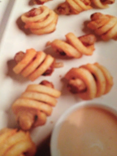 Heat about 2" vegetable oil in a large pot over medium high heat until a deep fry thermometer registers 375 degrees F. Dip the franks into the batter, then carefully wrap a long curly fry around each.