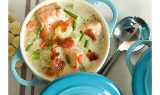 Add the milk, half-and-half, salmon, parsley, and dill. Season with pepper, to taste. Simmer over low heat until the fish is cooked through and the liquid is steaming, but not boiling, about 5-8 minutes. Season with the salt and pepper, to taste. Transfer to serving bowls and garnish with the crispy bacon pieces and chives. Serve with oyster crackers, if desired.