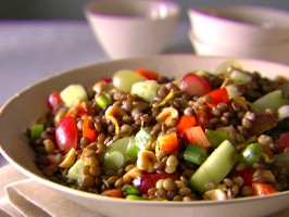 Bring a large pot of salted water to a boil over high heat. Add the lentils and cook until tender, stirring occasionally, about 18 to 20 minutes. Drain and let cool for 5 minutes. Place lentils and remaining salad ingredients in a large salad bowl.