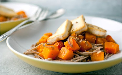 STIR FRIED WINTER SQUASH w/TOFU & SOBA