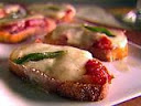 Place the slices of ciabatta on a parchment lined baking sheet. Bake until crisp and golden around the edges, about 8 minutes. Remove the bread from the oven. Place the prosciutto slices and mozzarella on the crostini toast and return to the oven to melt the cheese, about 8 more minutes.