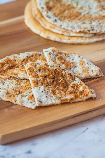 Coat a large frying pan with oil and on low heat, allow to heat up completely. Once hot, pour 1/4 of the mixture into the pan and cover immediately. Once bubbles start to appear on the edges, remove cover and flip and cook for 1-2 minutes. Repeat the process until you have four, large flatbreads.