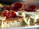 Slice bread horizontally to create 2 pizzas. Lightly oil a baking sheet and place pizzas crust side up. Brush top with 1/4 cup oil. In a bowl, squeeze tomatoes to break up slightly. Place on pizza halves. Pull pieces of Buffalo mozzarella from the ball and place on halves. Top with porcini mushrooms, shredded mozzarella, garlic and pepperoni. Bake until cheese has melted and crust is crispy, about 25 minutes. Remove from oven, drizzle with oil, sprinkle on Parmesan and spread with cut basil. Sprinkle with salt and pepper and serve.