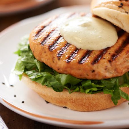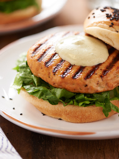 Form 4 patties, place them on a plate, and refrigerate for 20 minutes. Lightly brush the outside of each patty with a little vegetable oil to prevent sticking, and place the salmon patties on the hot grill. Cook for 3–4 minutes, or until char marks appear. Flip the patties and cook until an instant-read thermometer inserted in the patties reads 155°F, about 4–5 more minutes. Serve the burgers on sesame seed buns and top with the wasabi mayo.