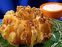 Fry the onion right side up in the oil for 10 minutes or until it turns golden brown. Remove the onion with a spider from the fryer and let drain on a sheet tray lined paper towels.