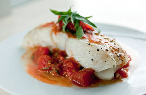 3. Place a spoonful of sauce on each plate, and place a piece of fish partially on top. Spoon some of the liquid from the baking dish over the fish. If you wish, top the fish with another spoonful of sauce, garnish with basil leaves and serve.