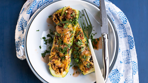 Cheesy Southwest Grains and Chorizo Zucchini Boats